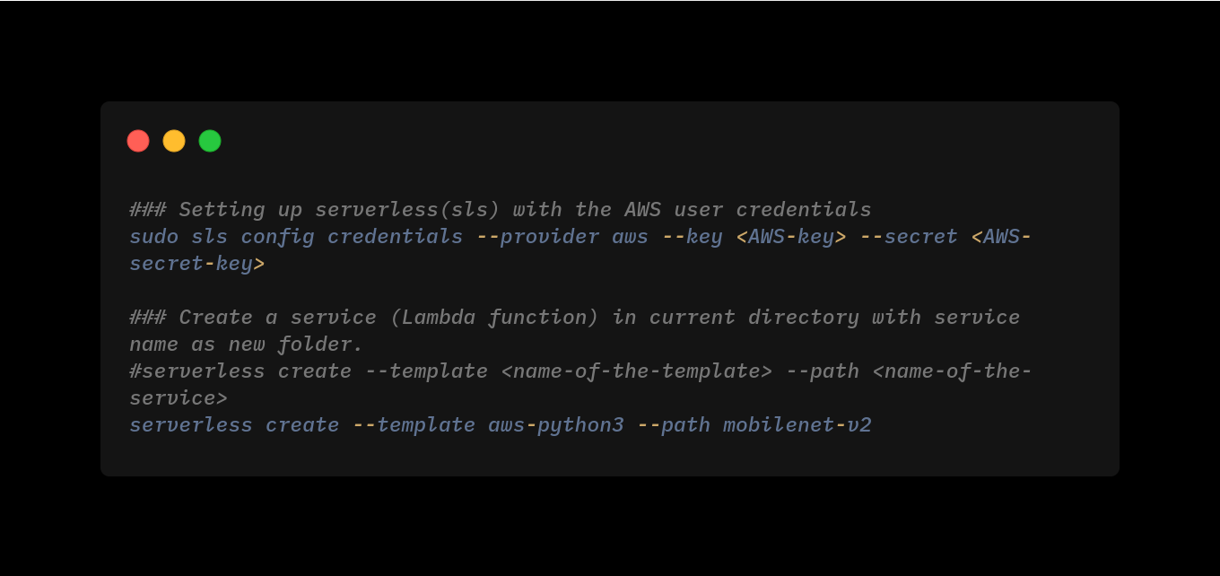 sudo sls config credentials --provider aws --key <AWS-key> --secret <AWS-secret-key>
